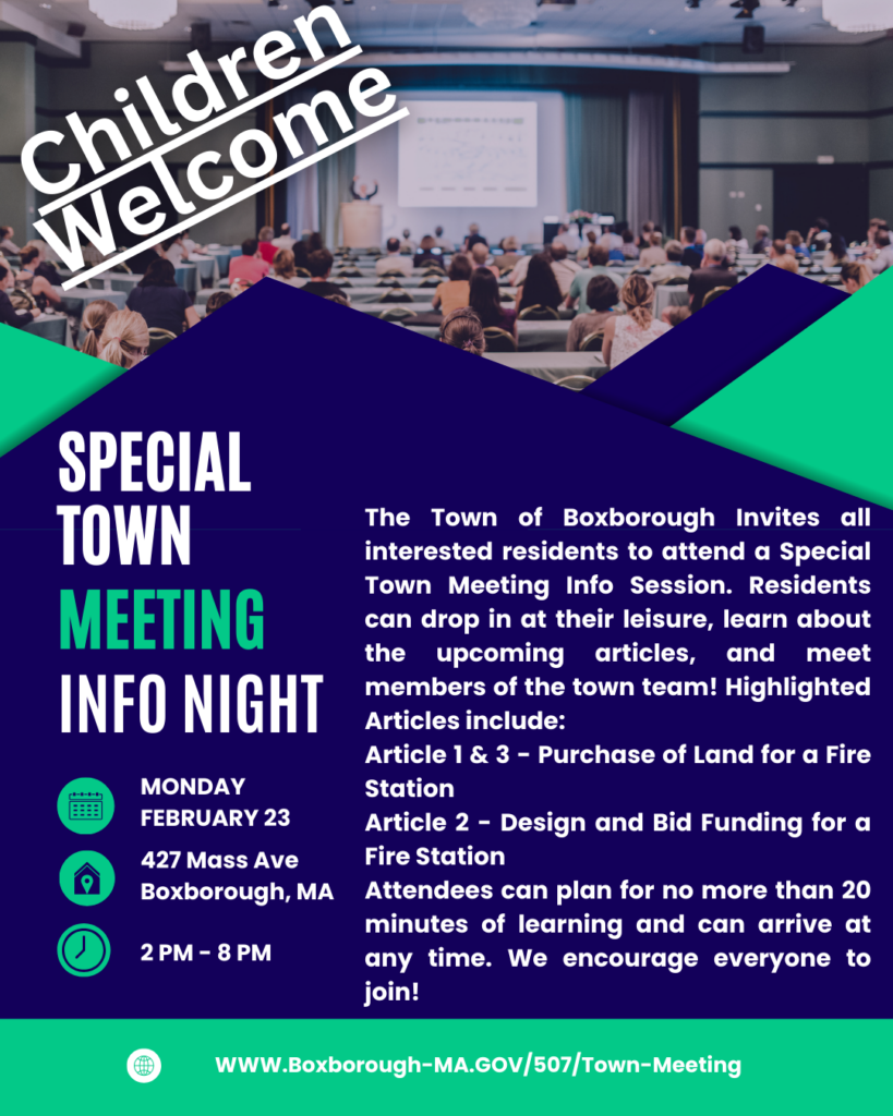 The Town of Boxborough invites all interested residents to attend a Special Town Meeting Info Session. Residents can drop in at their leisure, learn about the upcoming articles.